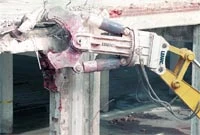 This demolition processor combines a twin-cylinder design with a unique jaw configuration, delivering quick demolition and efficient processing of reinforced concrete structures. The single-piercing tooth on one jaw concentrates the crushing force into a single intense point. The attachment incorporates standard 360-degree powered rotation with a heavy-duty turntable bearing that facilitates positioning for vertical, horizontal or angled structures. Available for excavators from 17.6 to 88 tons.