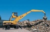 These wheeled material handlers are designed to meet the production requirements of the scrap, millyard, demolition and bulk handling industries. They offer increased horsepower and hydraulic flow for improved performance. Longer service intervals and easier maintenance boost availability and lower operating costs. The HM model has a wheel base of 9 feet 10 inches and an operating rate of 69,444 pounds, and the LMH model has a wheel base of 10 feet 5 inches and an operating weigh of 81,569 pounds. The two-stage automatic speed control reduces engine speed when power demand is low for improved fuel efficiency, reduced sound and improved operator comfort. The implement circuits are designed specifically for material handling. The material handlers feature structural components purpose-built for durability in demanding applications. The improved transmission and new axles provide high torque and durability for heavy pulling. Feature a maximum horizontal reach of 51 feet 4 inches from swing center, and a maximum vertical pin height of 56 feet 2 inches on the MH and 56 feet 4 inches on the MHL.