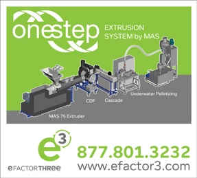EFactor3, Charlotte, N.C., the North American distributor of the OneStep extrusion system by MAS will debut the technology to the North American market at this year’s NPE Tradeshow in Orlando.The OneStep system is designed to combine the recycling and compounding processes into a single step. According to eFactor3, the extrusion system “brings together the familiar superior plastification and homogenization of a parallel twin screw extruder with the specific advantages of the conical twin screw system.”
