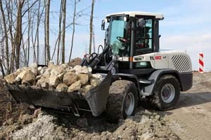 The Terex TL80 Compact Wheel Loader is 59 horsepower, with bucket capacities between 1.0 cubic yards and 1.6 cubic yards and achieves a breakout force of 10,128 pounds.
