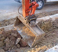 Tilt bucket designed specifically for use with mini-excavators. Allows contractors to grade, load, excavate and even handle slabs of sidewalk. It can tilt 45 degrees in either direction. The tilt bucket is available for all models and makes of mini-excavators.