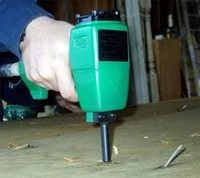 Denailer is designed to remove nails from wood without damaging it for lumber salvage and reuse. It is powered by an air compressor. The pneumatic hand-held tool aligns with the point of the nail, allowing the use to straighten the nail so that it is perpendicular to the board. When the user pulls the trigger, the nail is ejected from the other side.