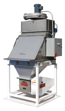 The system incorporates a built-in Delumper processor to reduce agglomerates and lumps and facilitate uniform product flow while the bags are being emptied. The Bagstation has a built-in dust filter system that draws the air through the unit grate and into the enclosed filter chamber. Filter media are periodically self-cleaned by a programmed air burst cycle.