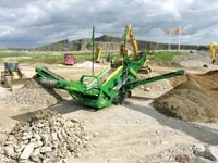 McCloskey International debuted a portable vibratory screener specifically designed with three screening decks at Hillhead 2007. Like the original two-deck S190 screener, the new version features McCloskey’s High Energy screenbox. The S190 is based on a 5-foot by 20-foot screenbox, which measures 190 square feet of total screening area. The S190-3D provides the same amount of screening mesh as the top deck. Altogether, the three decks provide 290 square feet of active screen. The three deck version uses a small dedicated conveyor to keep fines moving through the system. Flow of material is also assisted by the steep angle settings available on the S190-3D, which offers five settings from 20 to 30 degrees.