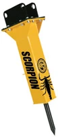 Scorpion Hydraulic Hammers from AIM Attachments are designed for use with skid steers, backhoes and excavators of all sizes. Scorpion Hammers are designed for the toughest jobs and have a compact design. The hammers have a boltless mounting system, designed for lower maintenance. In addition, the line features vibrosilencing to reduce the total operator and carrier machine vibration exposure.