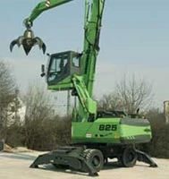 A wheeled material handling machine weighing 63,300 pounds, it is powered by a 204 hp, water-cooled Deutz diesel engine. It features a maximum lifting capacity of 29,100 pounds and a maximum working radius of 46 feet, 7 inches. This material handler is designed for businesses looking for Sennebogen efficiency for highly mobile “pick-and-carry” material handling without the need for the heavy lifting capacities of the 835 and 870 green line machines without a reduction in cab size. The flow-on-demand hydraulic system keeps all functions operating responsibly while saving energy. It is engineered for simple, efficient, reliable operation without any electronic controls on the hydraulic system and equipped with an advanced Sennebogen diagnostic system that monitors essential machine functions with audible and visible warnings. The material handler is offered on an all-wheel drive carriage with solid rubber or pneumatic tires and four-point outriggers for additional stability.