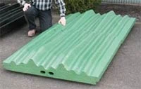 Columbia Steel, based in Portland, Ore., is touting its slab breaker jaws as a solution for contractors who have difficulty breaking concrete and asphalt slabs. The company says its slab breaker jaws are based on traditional and high-tooth jaw designs, but with additional raised slab breakers in pitch with conventionally located teeth. The number of slab breakers is proportional to the width of the crusher’s size and model, allowing the operator to set the discharge for a reasonable opening and still break slabs that otherwise would flow through the crushers, according to the company.