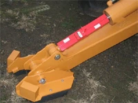 This anti-theft device can mechanically lock the drive controls of backhoes. It locks the stabilizer arm of all backhoes in the downward position, raising the wheel off the ground. Two hinged halves surround the exposed hydraulic cylinder and are secured together with a built-in four dial combination lock. The combination can bet set at any number once the devise is open.