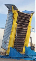 TEME Engineering has developed a tilter station, where the container is unhitched from the trailer and secured to the tilter. Once locked into place, the Tilter lifts the container free from the trailer, allowing the trailer to be driven away. The doors of the empty container are then opened against the automated closing mechanism. The Tilter then lifts the container up to 90 degrees to allow for a crane, conveyor or magnetic pick-up to load the material into the receiving container. Load cells within the base of the Tilter monitor the desired load weight to ensure the load remains in compliance with transportation and shipping regulations. At the conclusion of the tilting process, the unloaded container’s doors are automatically closed in sequence and held shut while it returns back to its home position.