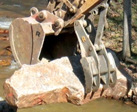 Thumbs are designed for material handling applications with excavators. They have a wide, curved design and three working positions. When not in use, WTS thumbs store on the stick with the strut. Thumbs