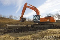The Zaxis 350LC-3 replaces the Zaxis 330LC and 370 excavators. Powered by a 6-cylinder, Tier 3-certified Isuzu engine, the machine weighs in at 77,269 pounds. The machine comes standard with a 13-foot, 1-inch arm, a 16,314-pound counterweight and 32-inch triple semi-grouser shoes. Other arm lengths are optionally available. The CRES II cab has a wider seatback, more foot room and 47 percent more glass on the right side than previous models and the color LCD multifunction monitor is multilingual. Operator can make oil flow adjustments, monitor 32 items and track maintenance for 14 items from his seat.